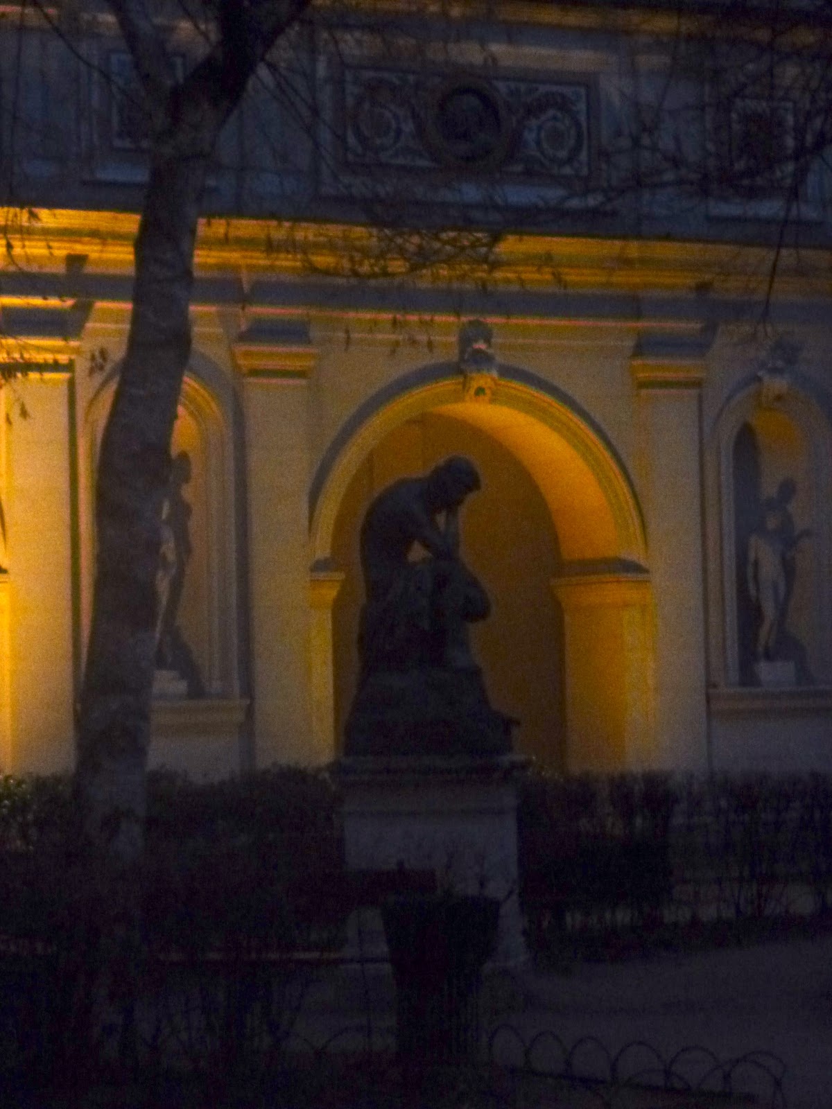 One of the gargoyles of the cathedral. All of the other gargoyles look like normal gargoyles. Marine told me that this one is modeled after the architect.